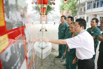 党员在宣传科学发展观文化长廊旁向职工宣讲学习实践科学发展观的重要性和必要性。